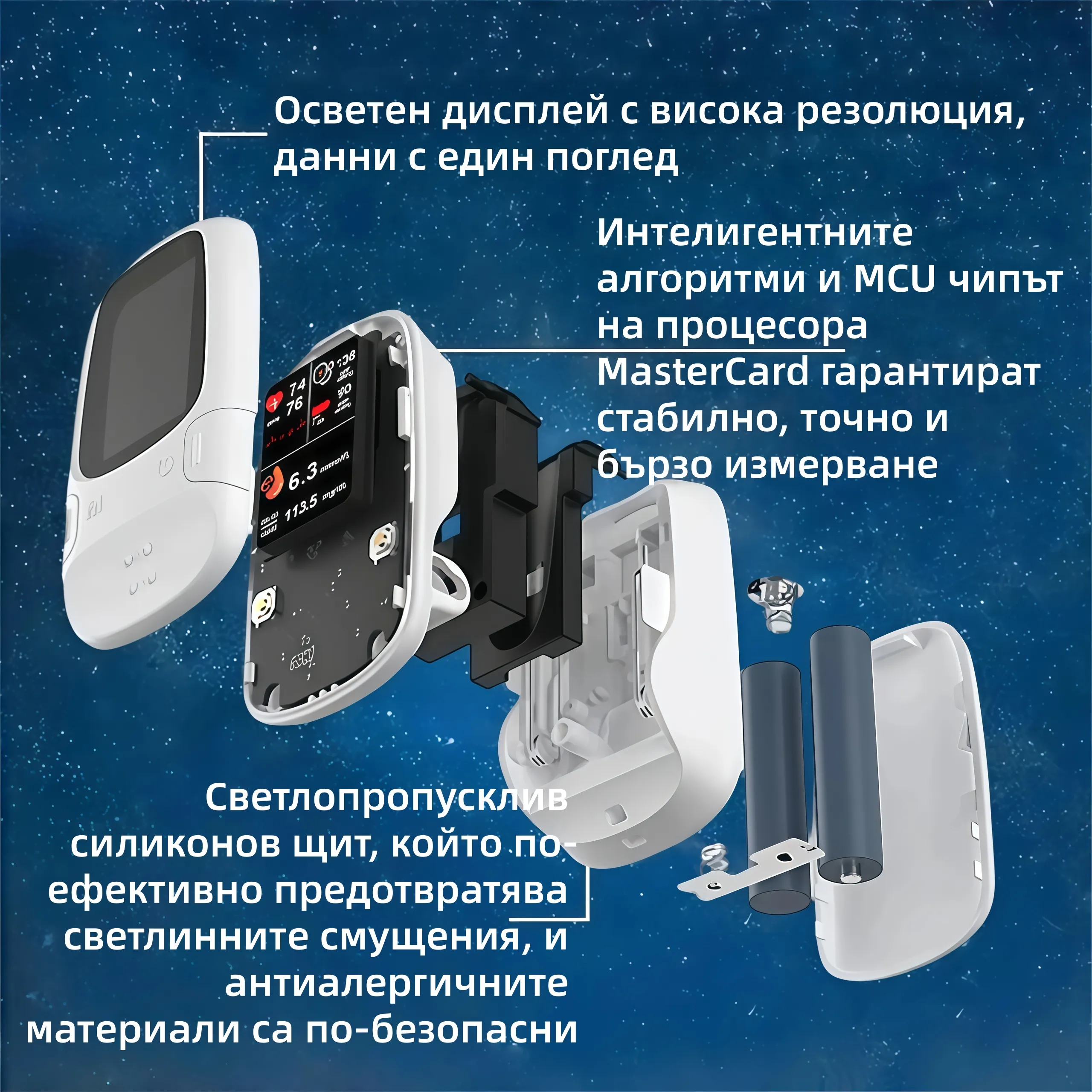 Чрез технологията на фотонния чип и процеса на измерване на оптичния абсорбционен спектър, устройството предоставя изключително прецизни стойности на кръвната захар.