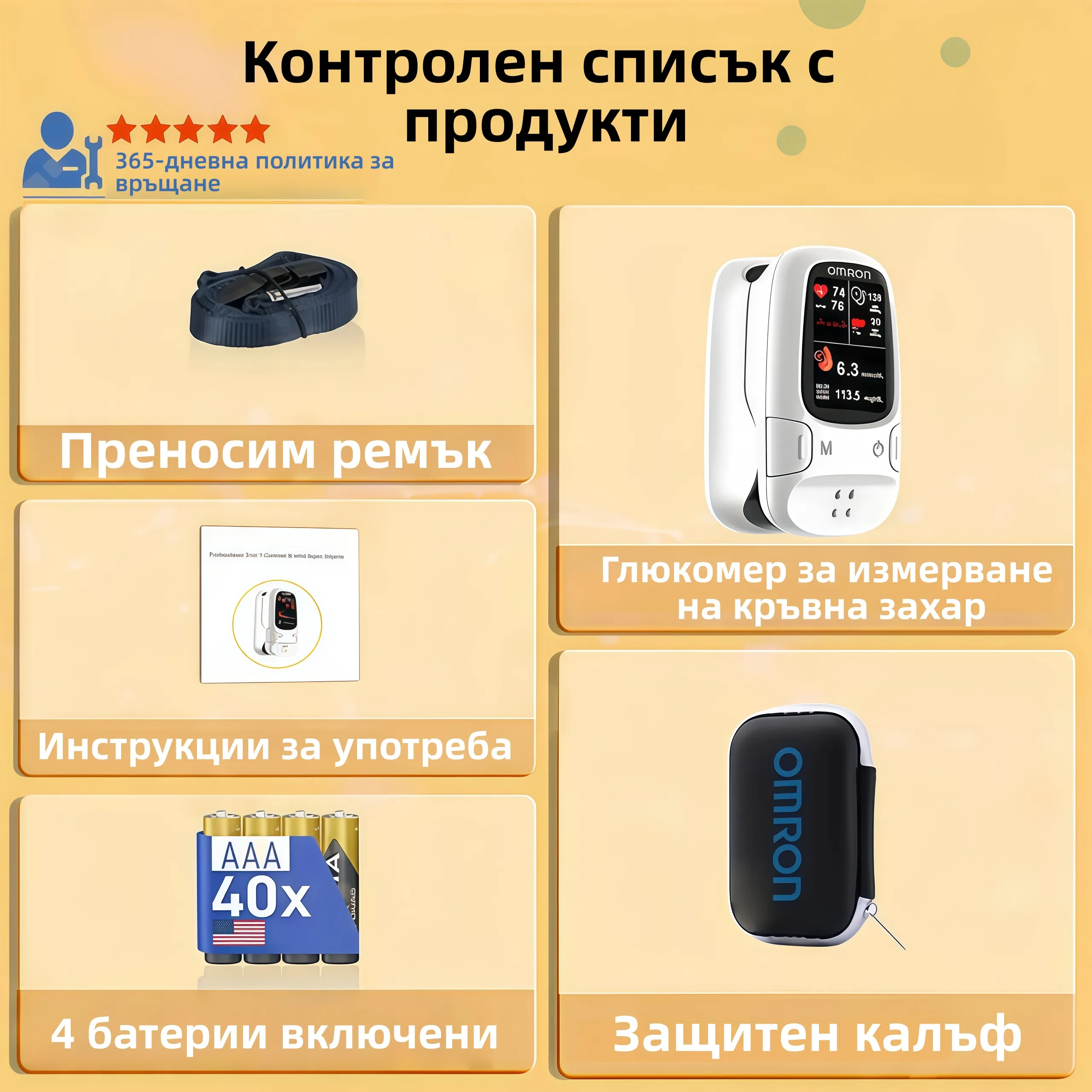 С 𝓞𝓶𝓻𝓸𝓷™ можете лесно да извършвате автоматичен и точен анализ на кръвната захар директно на върха на пръста си, по всяко време.Нашият неинвазивен глюкомер е сертифициран от 𝓤𝓢𝓐, 𝓒𝓢𝓐, 𝓕𝓓𝓐, 𝓘𝓢𝓞 𝟏𝟑𝟒𝟖𝟓, 𝓖𝓜𝓟, 𝓣𝓤̈𝓥 𝓢𝓤̈𝓓 и 𝓒𝓔.Той осигурява високопрецизни измервания, които са същите като професионалните медицински устройства. Поръчайте с увереност!Този истински неинвазивен глюкомер ще промени напълно начина, по който мислите за измерване на нивата на кръвната захар.