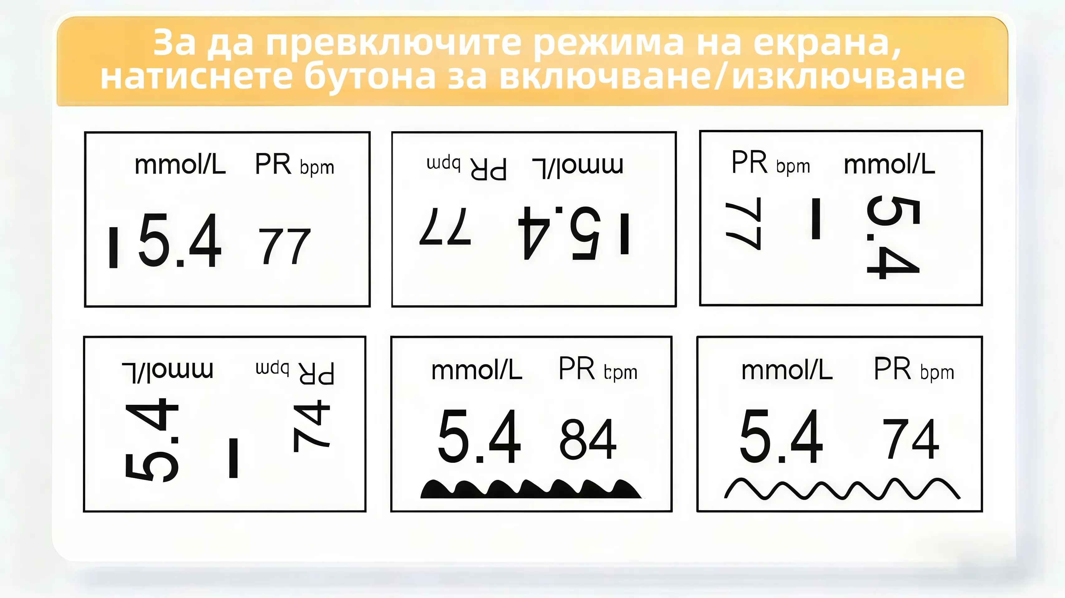Лесно превключвайте между 𝟔 различни ъгъла на екрана, за да виждате данните си оптимално от всяка позиция.След като бъде включено, устройството 𝓞𝓶𝓻𝓸𝓷™ автоматично превключва между режимите на показване всеки път, когато натиснете б утона за захранване, така че показанията ви да са удобни за четене от всеки ъгъл.